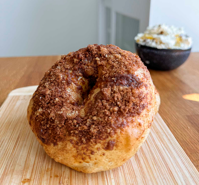 Our sourdough cinnamon crunch bagel is perfectly chewy with swirls of warm cinnamon and a sweet, crunchy topping baked to golden perfection.