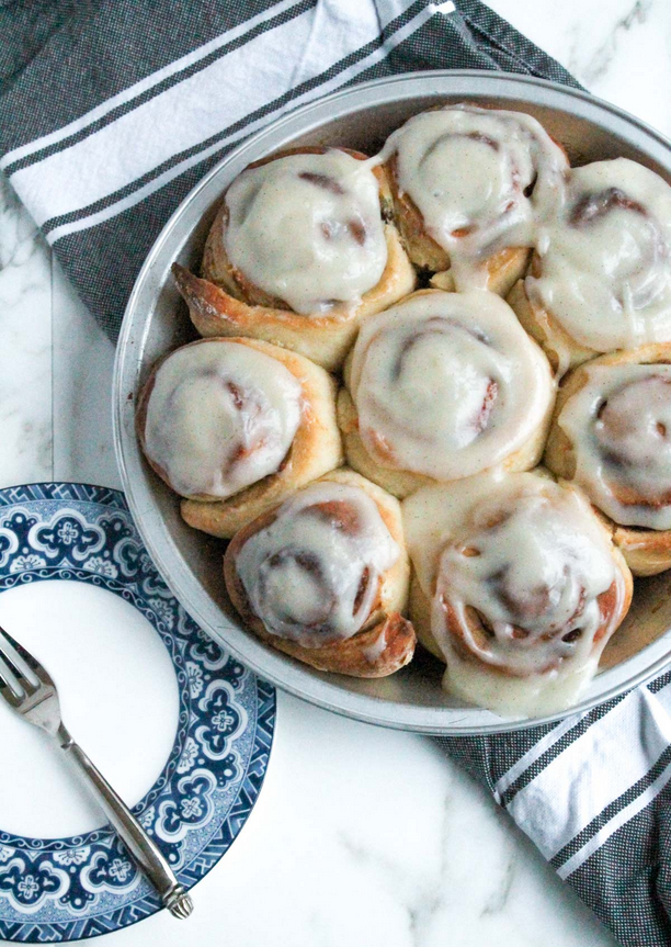 Our frosted sourdough cinnamon rolls are soft, fluffy, and swirled with warm cinnamon sugar, finished with a smooth, sweet glaze on top.